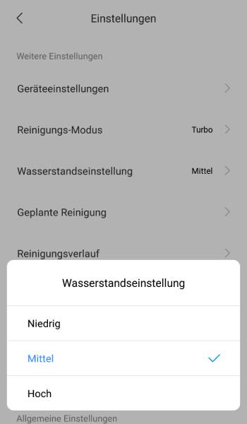 In der App kann die abzugebende Wassermenge im Wischmodus an jede Art des Bodens angepasst werden. Es stehen hier nämlich drei unterschiedliche Stufen der Feuchtigkeitsabgabe zur Verfügung: Niedrig – Mittel – Hoch. In unserem Raum mit Fliesen haben wir den Dreame Roboter mit maximaler Wasserstufe wischen lassen, sodass auch schwere Verunreinigungen entfernt werden. Auf einem Parkettboden würden wir hingegen immer zu der niedrigsten Stufe raten, sodass nur nebelfeucht durchgewischt wird, um den Untergrund nicht zu beschädigen.