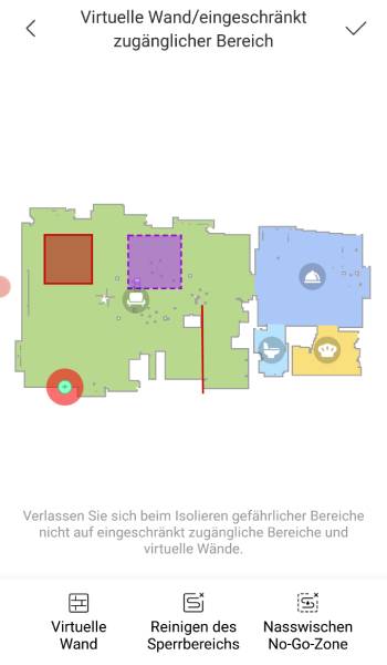 No-Go-Zonen: In der App gibt es auch die Möglichkeit eine ganze Sperrfläche durch das Aufzeichnen eines beliebig großen Rechtecks zu erstellen. Der darin befindliche Bereich bleibt vom Roboter unberührt, wobei alles rundherum ausnahmslos gesaugt wird. Das eignet sich im Alltag vor allem für das Abgrenzen von empfindlichen Gegenständen, wie beispielsweise Futternäpfe von Haustieren.