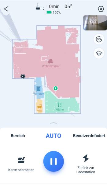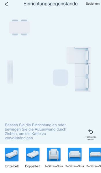 Als kleines Extra bietet der Roboter auch eine 3D-Kartenerstellung, mit welcher eine gezielte Reinigung unter den Möbelstücken möglich ist. Nach mehreren Versuchen mussten wir aber feststellen, dass die 3D-Kartenerstellung noch nicht einwandfrei funktioniert. In unserem Fall wird die Räumlichkeit nicht dargestellt, somit ist es uns auch nicht möglich virtuelle Möbelstücke richtig zu platzieren. Ohne platzierte Möbelstücke lässt sich auch keine Reinigung unter diesen befehlen.