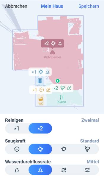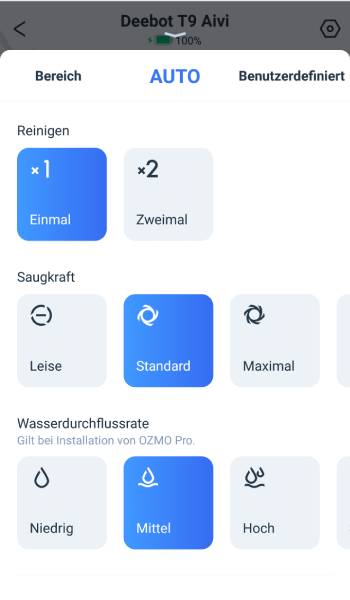 Die abzugebende Wassermenge wird mittels Wasserpumpe geregelt. Hierfür kann man in der App aus vier verschiedenen Stufen wählen: niedrig – mittel – hoch – sehr hoch. Die niedrigste Wasserabgabemenge eignet sich hervorragend für empfindliche Bodentypen, wie zum Beispiel Parkett. Hier wird lediglich ein leichter Sprühnebel abgegeben, um den Untergrund vor übermäßiger Nässe zu schützen. Für unempfindliche Böden, wie z. B. Fliesenboden oder für sehr starke Verschmutzungen eignet sich die höchste Stufe der Wasserabgabemenge.