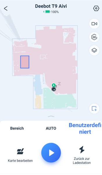 Sperrfläche: Soll ein bestimmter Bereich vom Roboter geschützt werden, wie zum Beispiel aufgebautes Spielzeug von Kindern, so kann eine Sperrfläche über einen solchen Bereich gezogen werden. Der T9 AIVI weiß, dass er eine solche Zone nicht befahren darf und hält sich demnach davon fern.