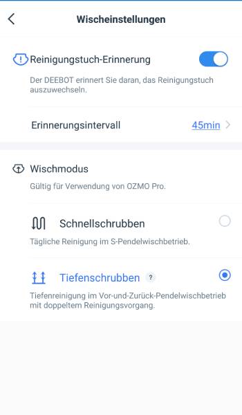 In der App kann man aus zwei verschiedenen Reinigungsmodi wählen: Schnellschrubben und Tiefenschrubben. In beiden Fällen reinigt die Wischplatte mit Vibration, bei der Variante Tiefenschrubben fährt der Roboter jedoch zusätzlich jede Bahn doppelt ab und erzielt somit ein noch besseres Ergebnis.