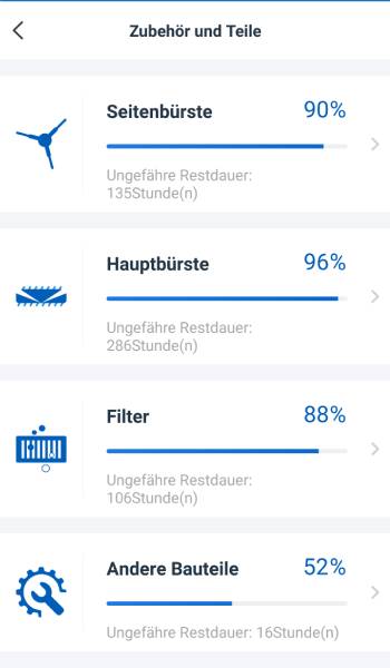 | Reinigungsprogramme | Saugkraft (Leise, Standard, Maximal, Maximal+), Wasserabgabemenge (Niedrig, Mittel, Hoch, Sehr Hoch), Auto, Bereich, Benutzerdefiniert, Ruhemodus |