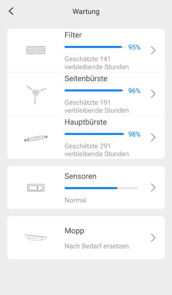 Um für Individualität zu sorgen, kann man hier zwischen zwei verschiedenen Wischvarianten wählen: Der Standardvariante und der gründlichen Variante. Letztere ist, wie der Name schon sagt, für eine besonders intensive Reinigung zuständig. Die Bahnen werden dann nämlich stärker überlappt, sodass der Roboter die Fläche mehrmals wischt.