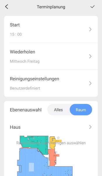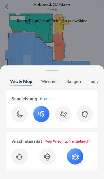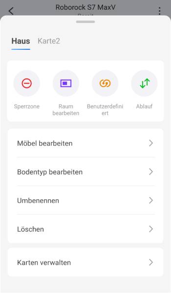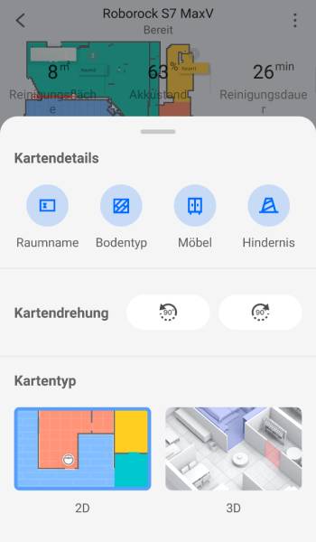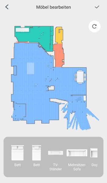 Mit der Kartenerstellung kann man dann auf verschiedene Features und Funktionen zugreifen, wie zum Beispiel die spezifische Möbelreinigung oder die Punktreinigung.