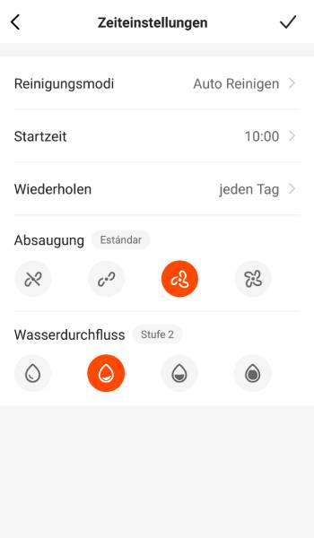 Anhand der App ist es möglich zwischen vier verschiedenen Stufen der Wasserabgabemenge zu wählen. Die niedrigste Stufe eignet sich hervorragend für empfindliche Böden, wie z. B. Parkett. Die höchste Stufe ist für Fliesenboden und / oder stärkere Verschmutzung gedacht, doch hierfür reicht unserer Meinung nach auch die vorletzte Stufe, denn bereits hier ist die Wasserabgabemenge sehr hoch.