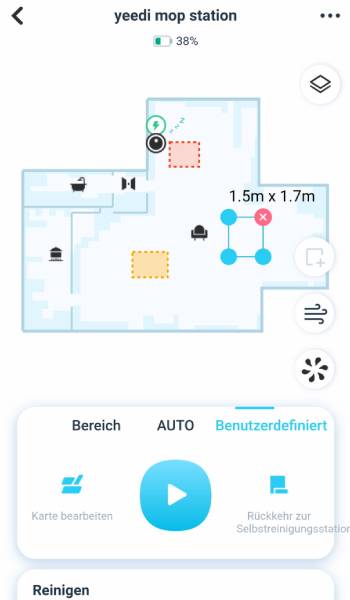 Mit dieser Funktion kann man ein rotes Rechteck aufziehen und an einer beliebigen Stelle platzieren. Die markierte Fläche wird dann zuverlässig vom Roboter gemieden, ganz egal ob er sich im Saug- oder Wischmodus befindet.