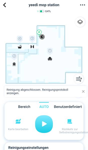 Abgesehen von den Bereichen, welche der Yeedi aus verschiedensten Ursachen ausgelassen hat, kann sich seine Arbeit hier wirklich sehen lassen! Mit den beiden rotierenden Wischmopps gelingt es ihm bereits im ersten Durchgang die Flecken gut zu lösen.